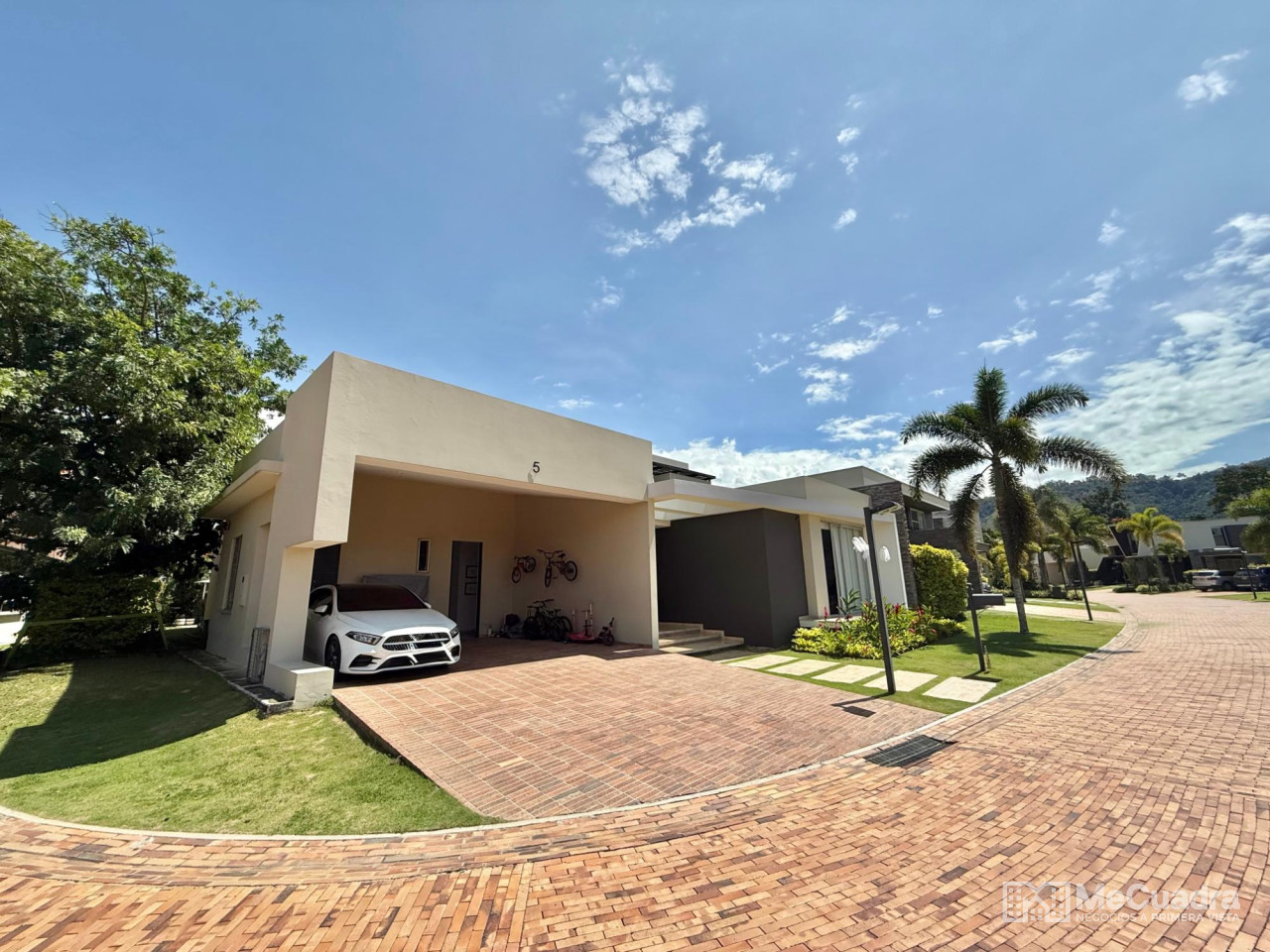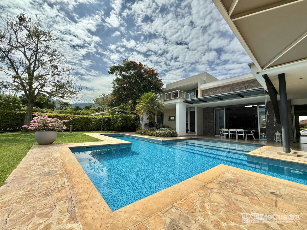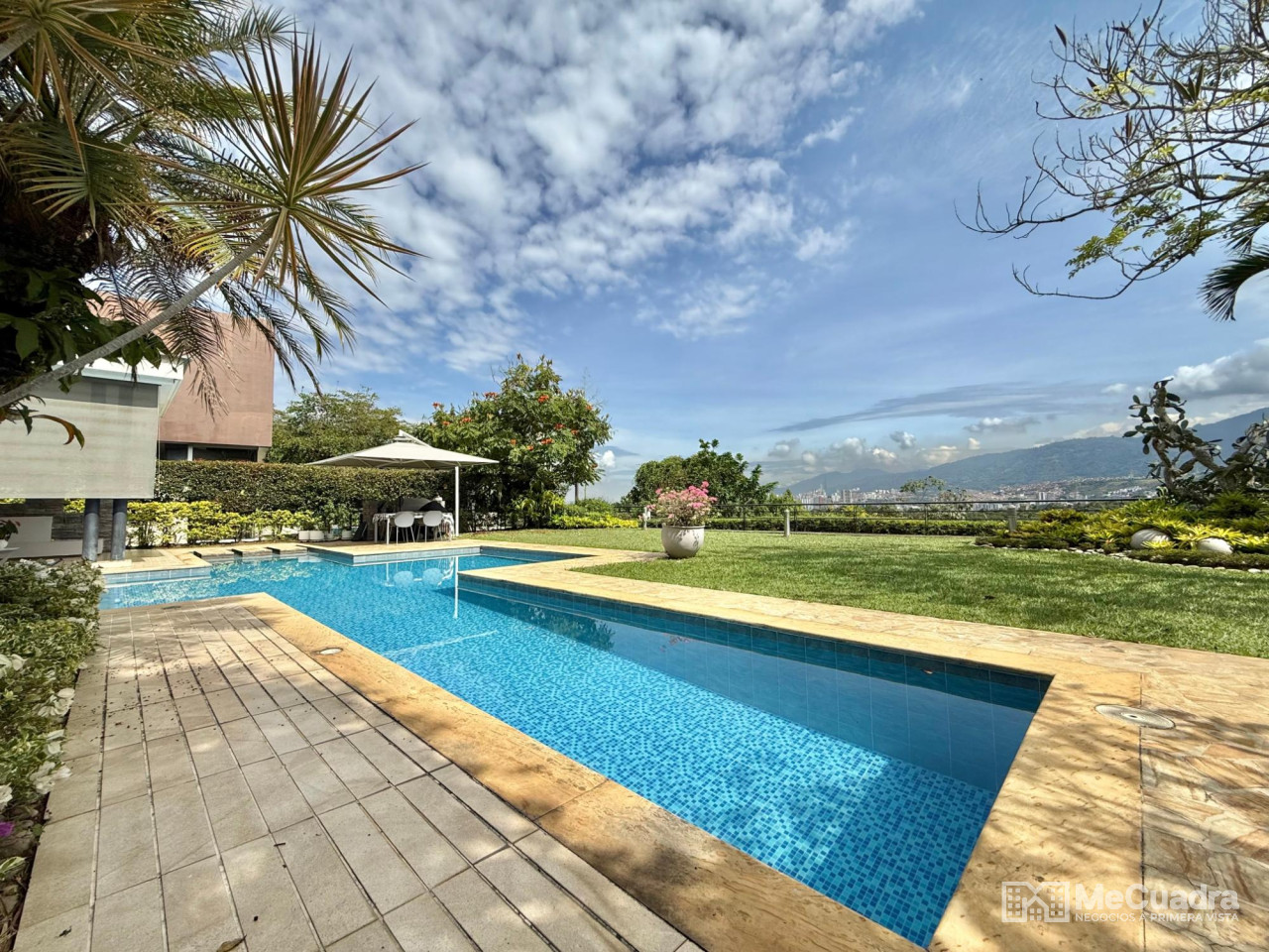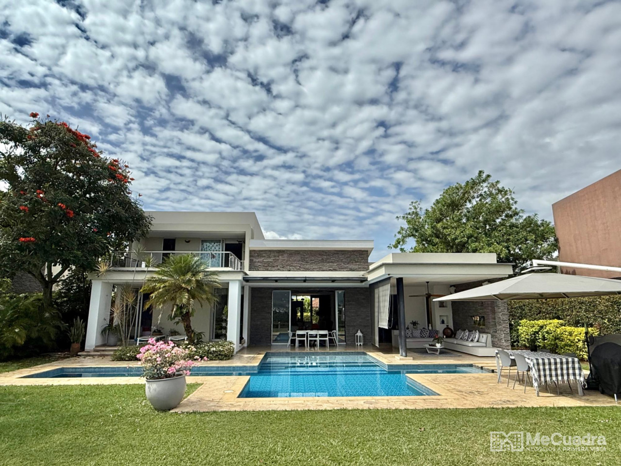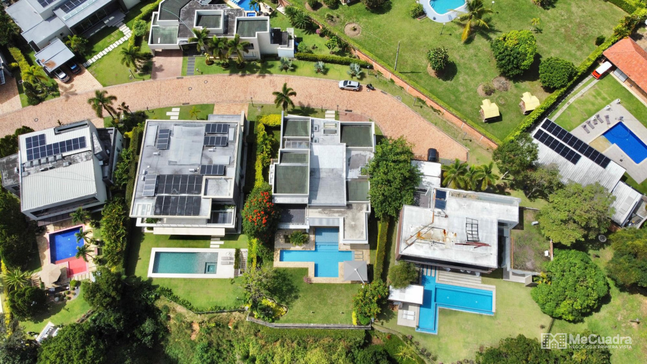 Lobby de acceso a la zona social con un gran salón con sala y comedor, alcoba principal con estudio, walk in closet, baño amplio, alcoba auxiliar doble con baño, estar de tv, baño de visitas, cocina, gran zona de ropas independiente, amplia alcoba de servicio con baño. Y en el segundo piso alcoba tipo principal con baño y terraza. 4 parqueaderos 2 cubiertos y 2 descubiertos.